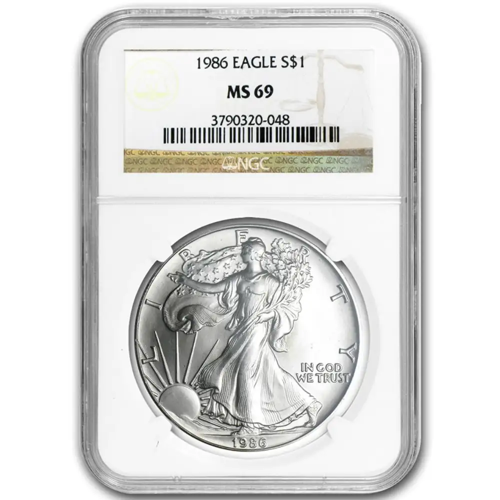 Spot +500,-kr 1.026,56 Ta bort produktbannerUtsolgt1986 USA 1 oz Sølv American Silver Eagle NGC MS69