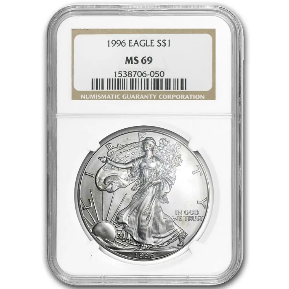 Spot +200,-kr 726,56 Ta bort produktbanner1996 USA 1 oz Sølv American Silver Eagle NGC MS69