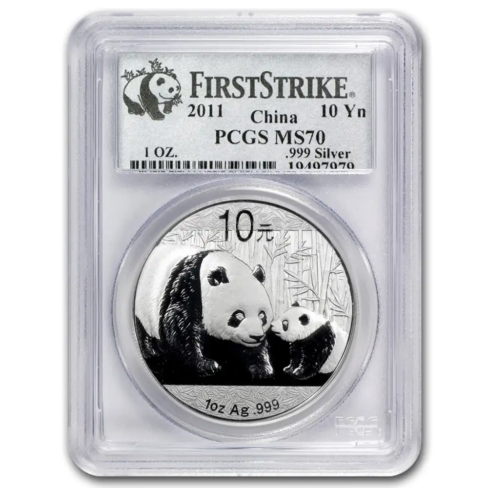 Spot +600,-kr 1.126,56Utsolgt2011 Kina 1 oz Sølv Panda PCGS MS70 Liten melkeflekk First Strike