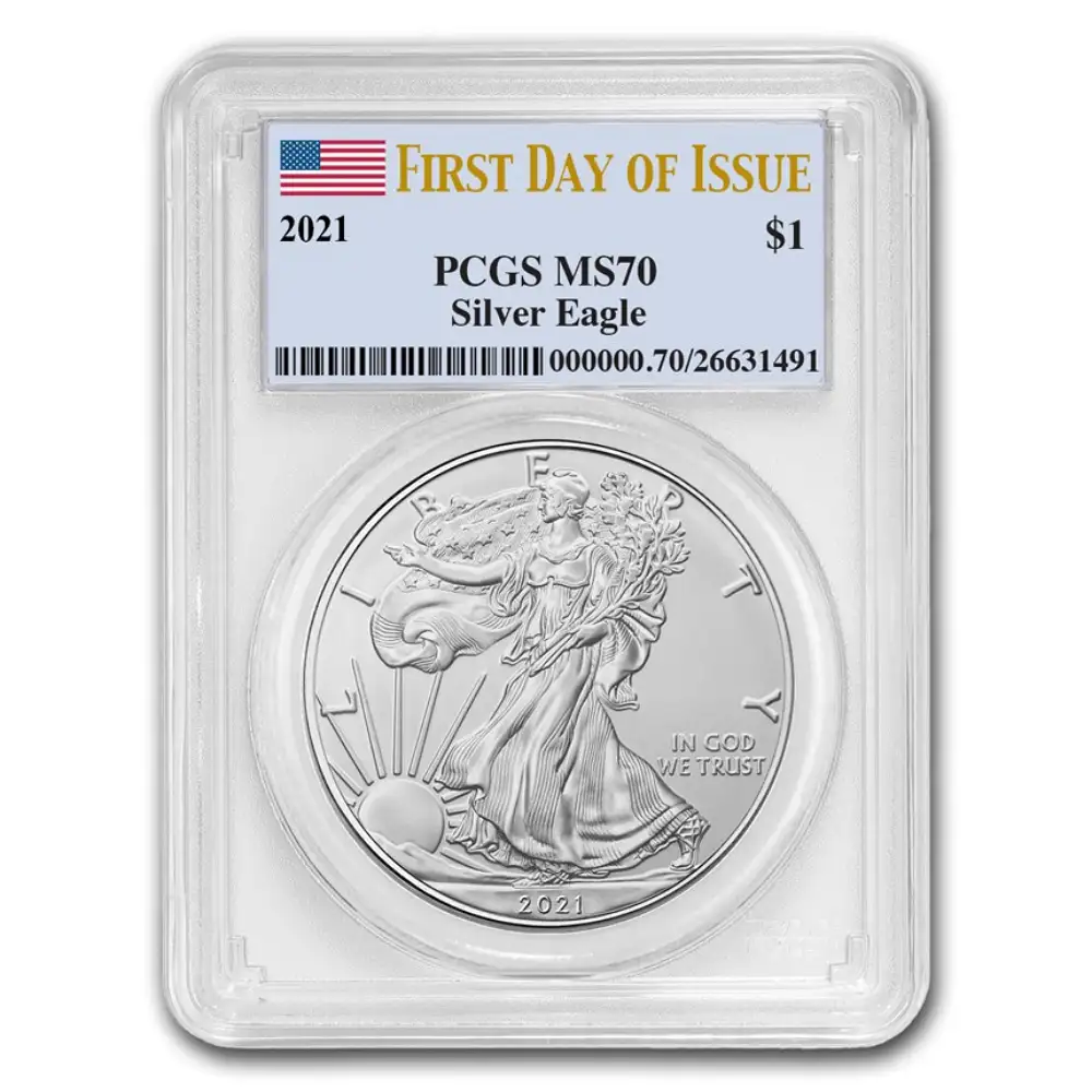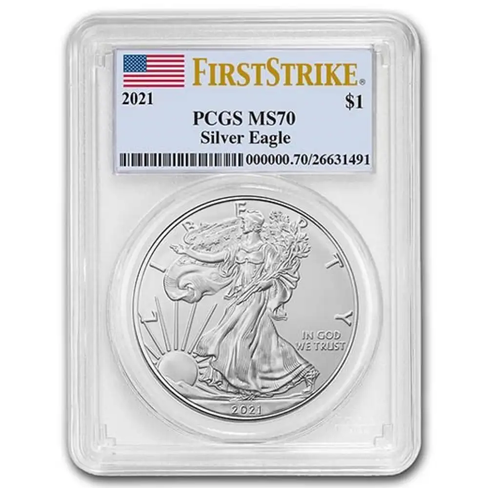 Spot +400,-kr 926,56 Ta bort produktbannerUtsolgt2021 USA 1 oz Sølv American Silver Eagle T1 PCGS MS70 FirstStrike