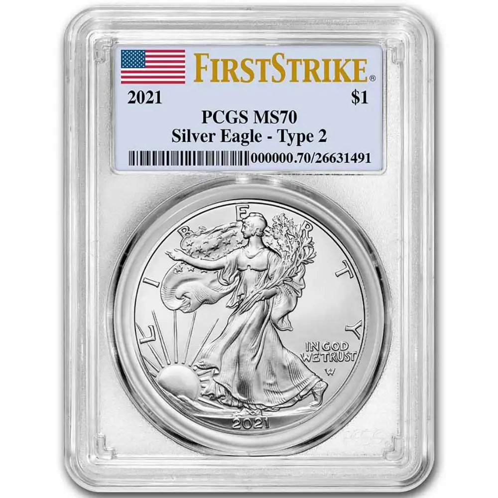 Spot +225,-kr 751,56 Ta bort produktbanner2021 USA 1 oz Sølv American Silver Eagle (Type 2) PCGS MS70 FirstStrike