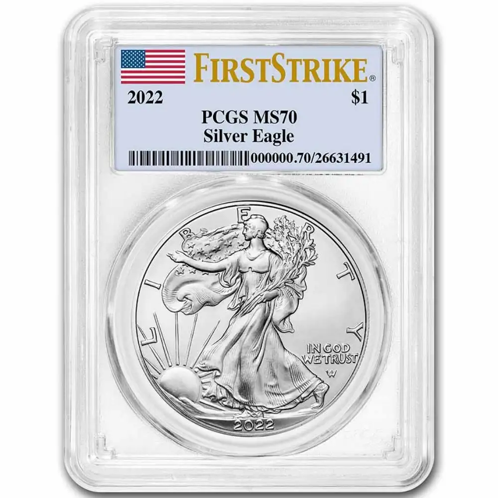 Spot +300,-kr 826,56 Ta bort produktbannerUtsolgt2022 USA 1 oz Sølv American Silver Eagle PCGS MS70 FirstStrike