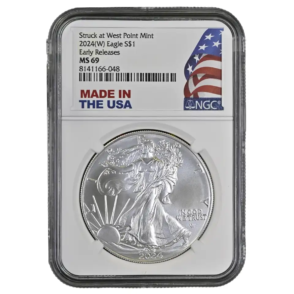 Spot +300,-kr 826,56 Ta bort produktbannerUtsolgt2024-W USA 1 oz Sølv American Silver Eagle NGC MS69 Early Releases