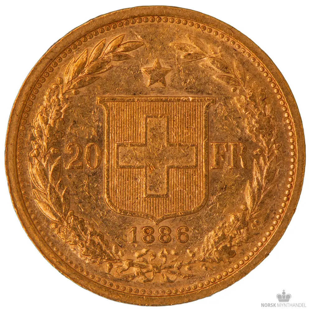 Spot +500,-kr 9.428,72Utsolgt1886 Sveits 20 Franc 5,8 gram Gull Kv Sirkulert M/Saflip & Garantibevis