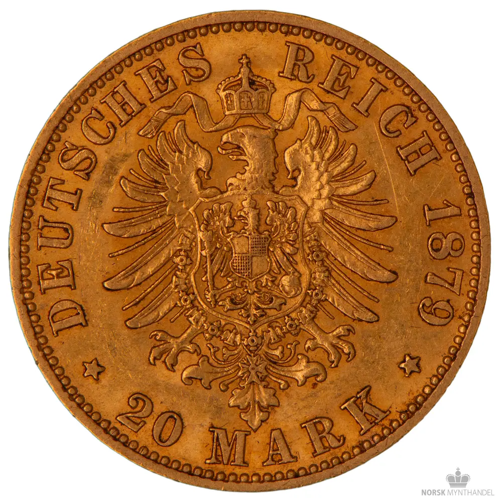 Spot +750,-kr 9.860,49Utsolgt1879-A Tyskland – Preussen 20 Mark 7,17 gram Gull Sirkulert M/Kapsel & Garantibevis