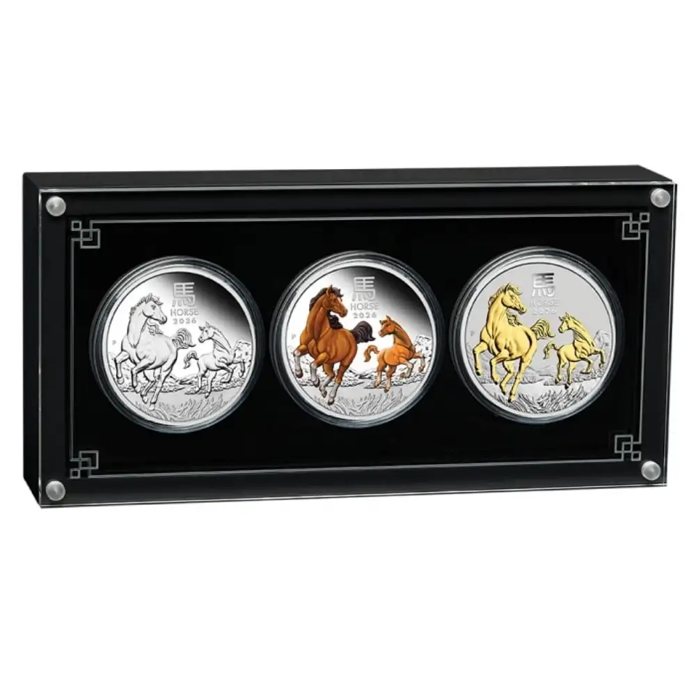 Utsolgt2026 Australia 3 oz Sølv Lunar S3 Year of the Horse Trio Sett M/Etui & COA