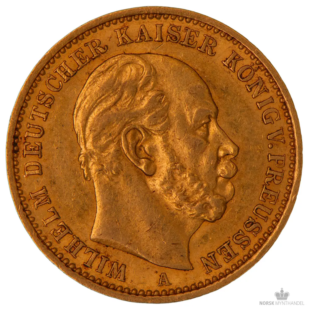 En pen og autentisk gullmynt fra 1800-tallet, preget under det tyske keiserriket. Disse myntene er ettertraktet blant både samlere og investorer for sitt historiske preg og sitt innhold av edelt metall.