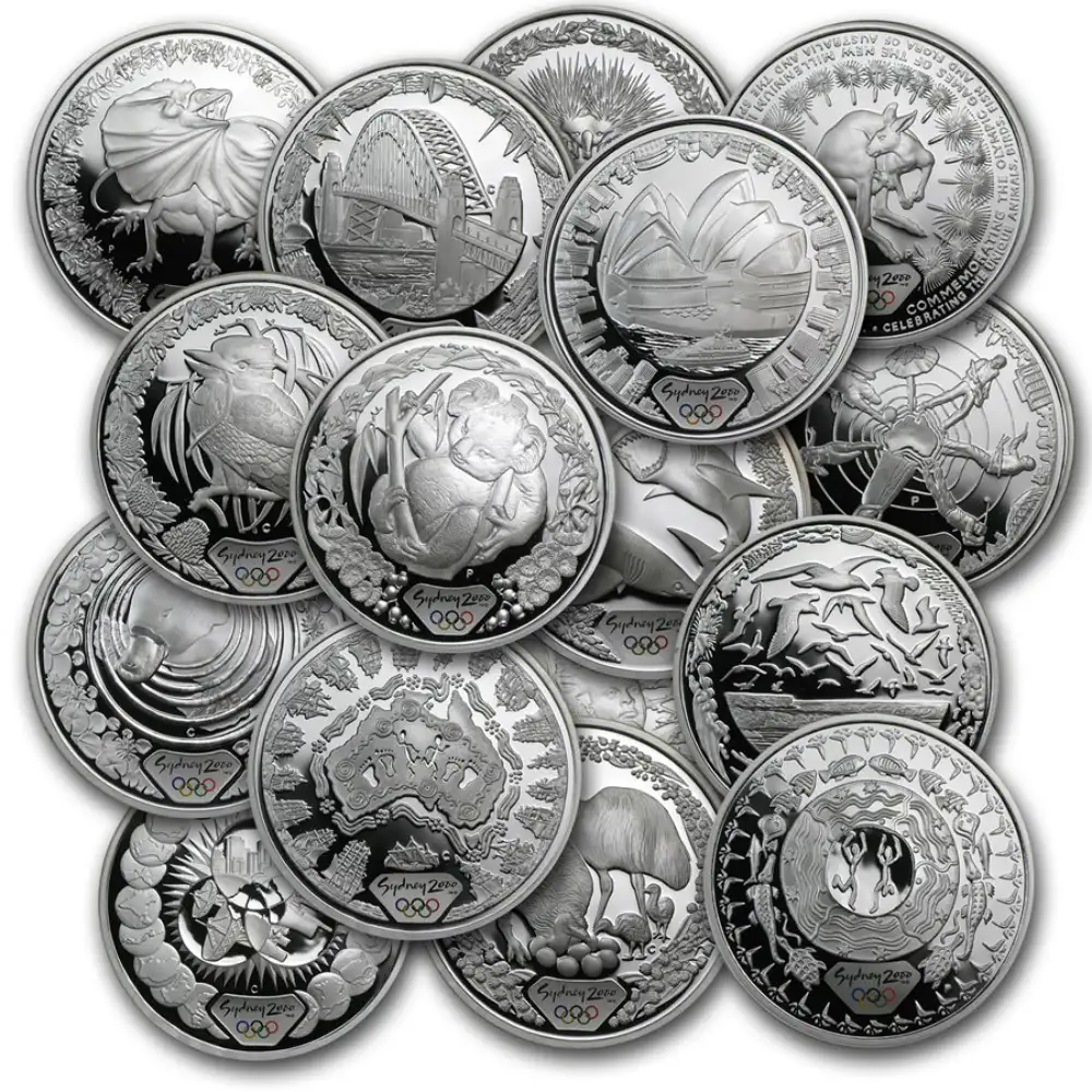 Dette er en meget spennende serie som ble preget i forbindelse med OL i sydney 2000. Myntene ble laget i et samarbeid mellom RAM /Royal Australian Mint) og Perth Mint, der de produserte åtte mynter hver.Det ble utgitt totalt 16 mynter i denne eksklusive OL serien med unike og ulike motiv tilknyttet Australia. Her selger vi alle utgivelsene samlet. De myntene som er preget av Perth Mint har et P myntmerke, mens de som er preget av RAM har ett C myntmerke. Myntene ligger i original kapsel, men kapselen har noen riper. Settet består av totalt 16 oz med rent sølv.