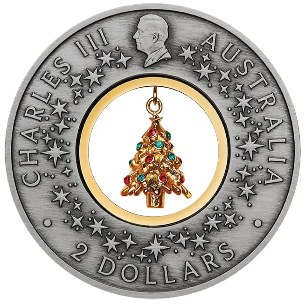 Midt i mynten finner du et nydelig juletre belagt med 24 karat gull og pyntet med ekte Swarovski-krystaller, som gir et eksklusivt og glitrende uttrykk. Sammen med farget antikkfinish og håndverkskvalitet i toppklasse blir dette en av årets mest stemningsfulle samlerutgivelser.